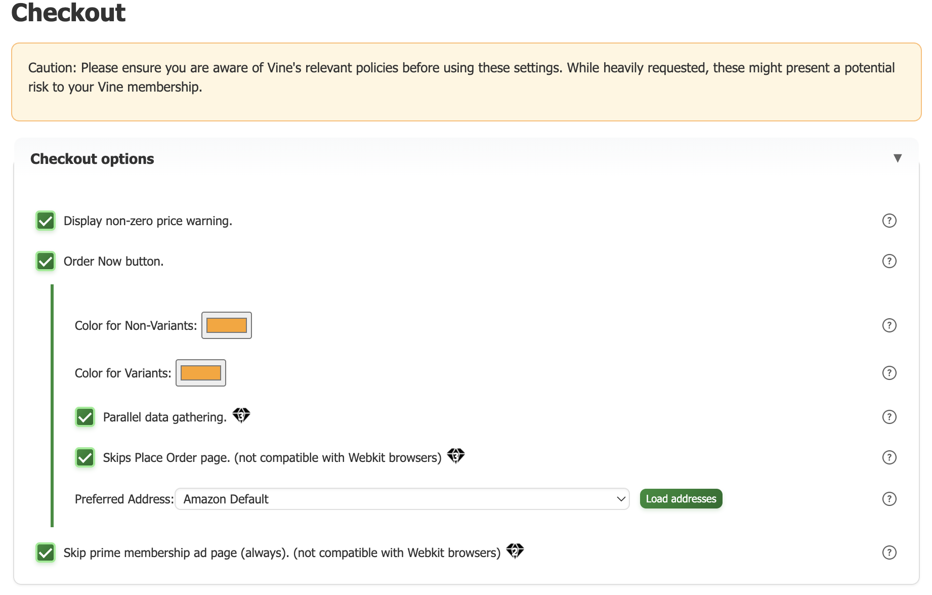Choose a specific delivery address for Order Now checkouts. If not default, it will be automatically selected during checkout. Click on Load Addresses to automatically fill the drop down with addresses pulled from Amazon. You can then choose an address to ship to during checking. Note: this will slow down the checkout to change your address to something other than the default.