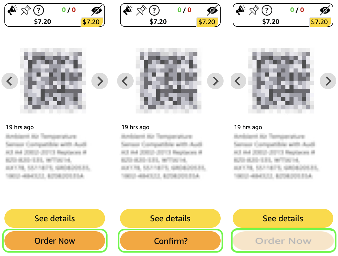Will add a "Order Now" button to the tiles on RFY, AFA, AI pages, as well as the notification monitor. When clicked, it will skip the See Details modal and open the checkout page in a new tab. If the product has variants, it will proceed with the first one. You must click a 2nd time to confirm you want to place the order. You will see Confirm? and there will be a 3 second timer before you see Order Now again. Once you confirm and the order process is started, the Order Now button becomes unavailable. Note, this is true even if you do not complete the order.